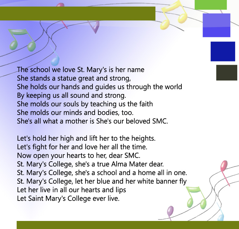 St. Mary's College of Meycauayan recognizes her role to respond to the call of the Church for renewed evangelization and the pursuit of academic excellence. Guided by the Gospel values and inspired by the virtues of Mary and Mother Ignacia del Espiritu Santo, it is committed to serve the community, the Church, and the society with preferential option for the poor. AS A CATHOLIC SCHOOL, SMCM is committed to develop persons who are "Makadiyos, Makatao, Makabayan at Makakalikasan" to overcome the prevailing threats in our society. AS A FILIPINO SCHOOL, SMCM is committed to uphold, preserve, and enrich the national heritage and enhance desirable Filipino values. AS AN RVM SCHOOL, SMCM is committed to work for the building of the Kingdom of God with Mary and Mother Ignacia del Espiritu Santo in communion with others to grow in love and service of others especially the poor.