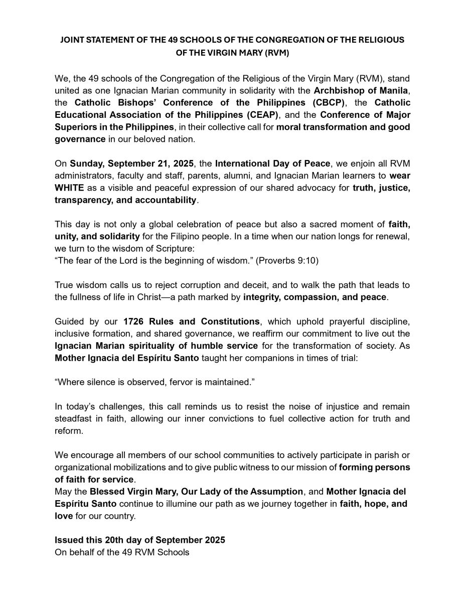JOINT STATEMENT OF THE 49 SCHOOLS OF THE CONGREGATION OF THE RELIGIOUS OF THE VIRGIN MARY (RVM)
